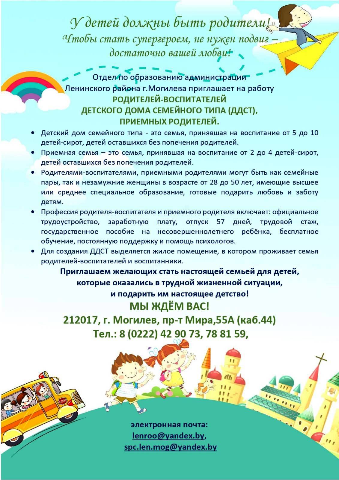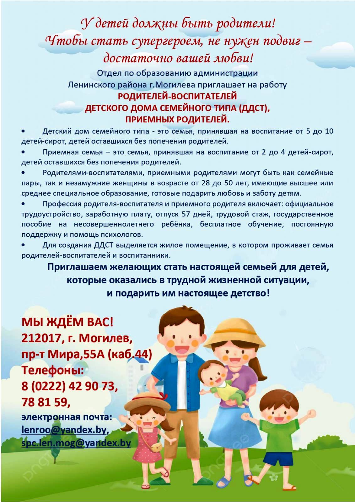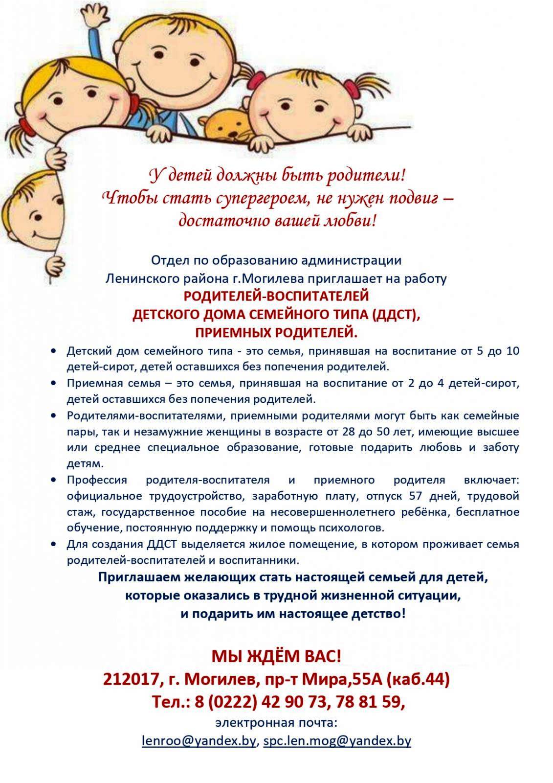 Главная страница > Отдел по образованию администрации Ленинского района г.Могилева приглашает на работу родителей-воспитателей детского дома семейного типа (ДДСТ), приемных родителей